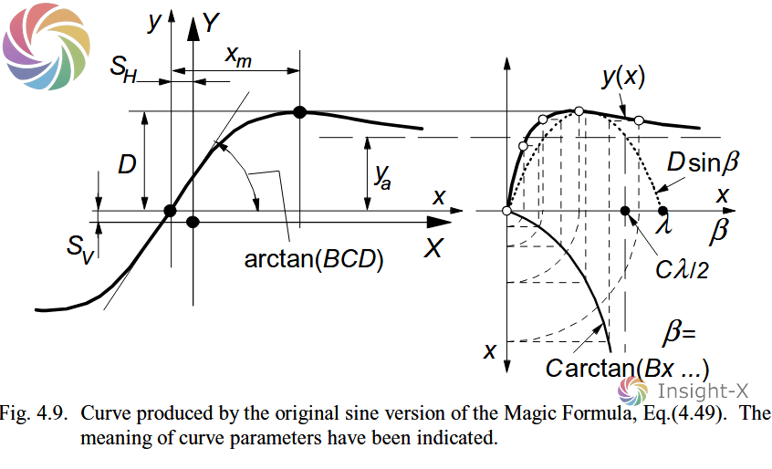 魔术公式 y(x) 通常产生一条曲线,经过原点 x=y=0,达到最大值,随后趋于水平渐近线。对于给定的系数 B,C,D 和 E,曲线关于原点呈反对称形状。为了使曲线相对于原点发生偏移以对准轮胎试验数据,引入了两个位移 SH 和 SV。由此产生一组新的坐标 Y(X)。