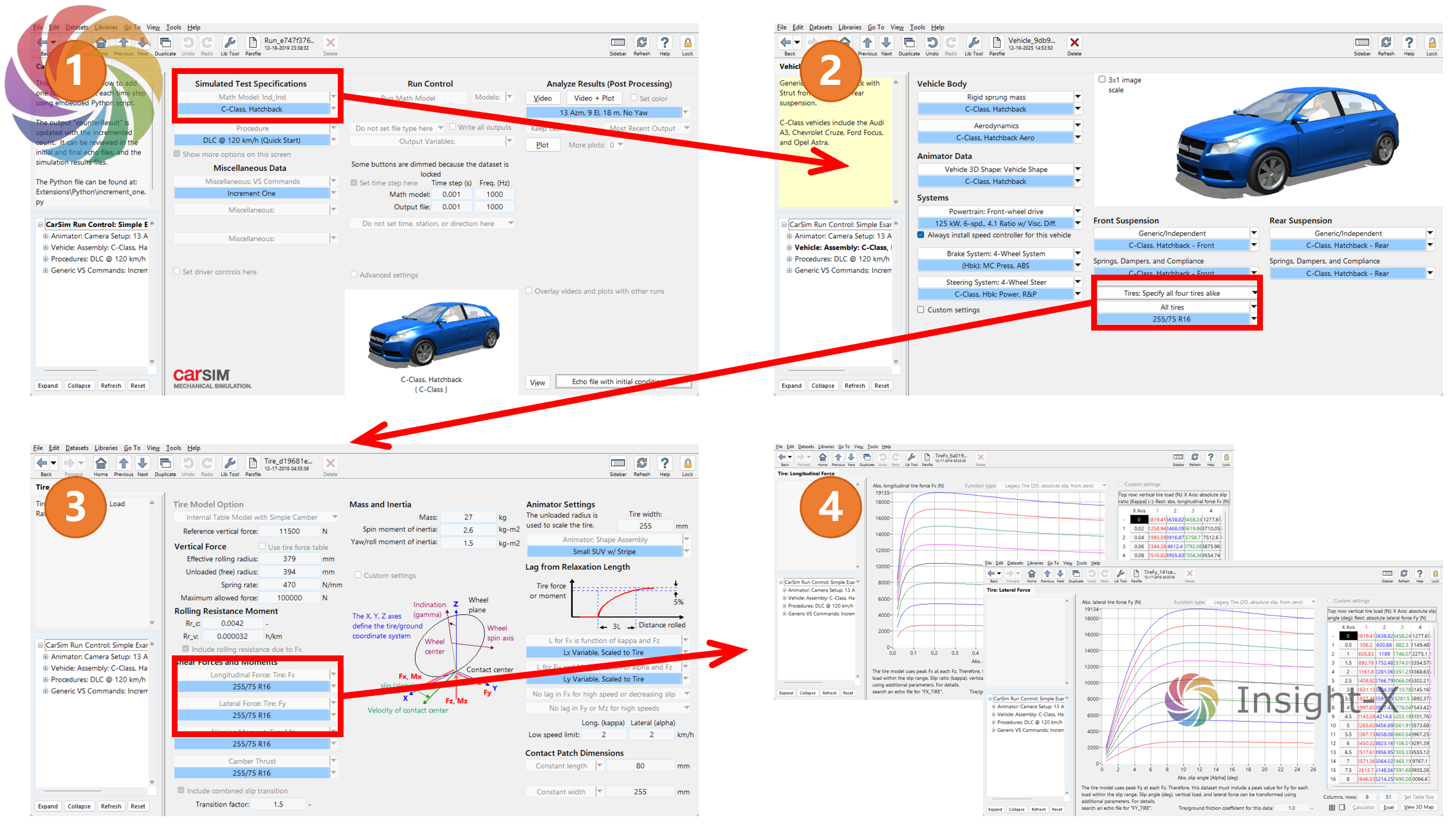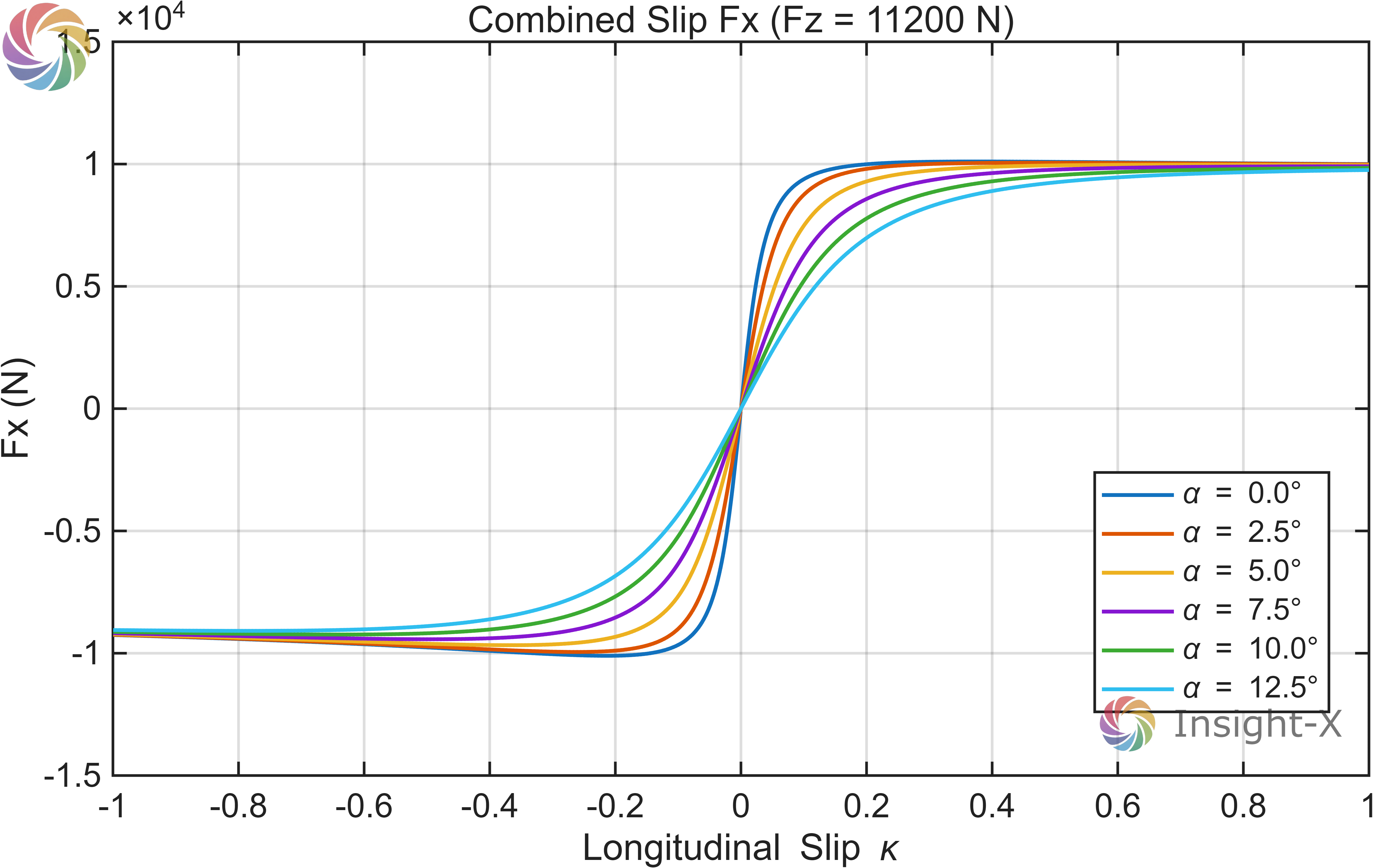 当我们在脚本中搭建好轮胎模型,也就是将上述公式转为代码并构建函数后,只要将4个输入量全部输入到模型中,即可计算出对应的轮胎力。并且注意输入量的单位,务必确认输入量 α 的单位为国标 rad。