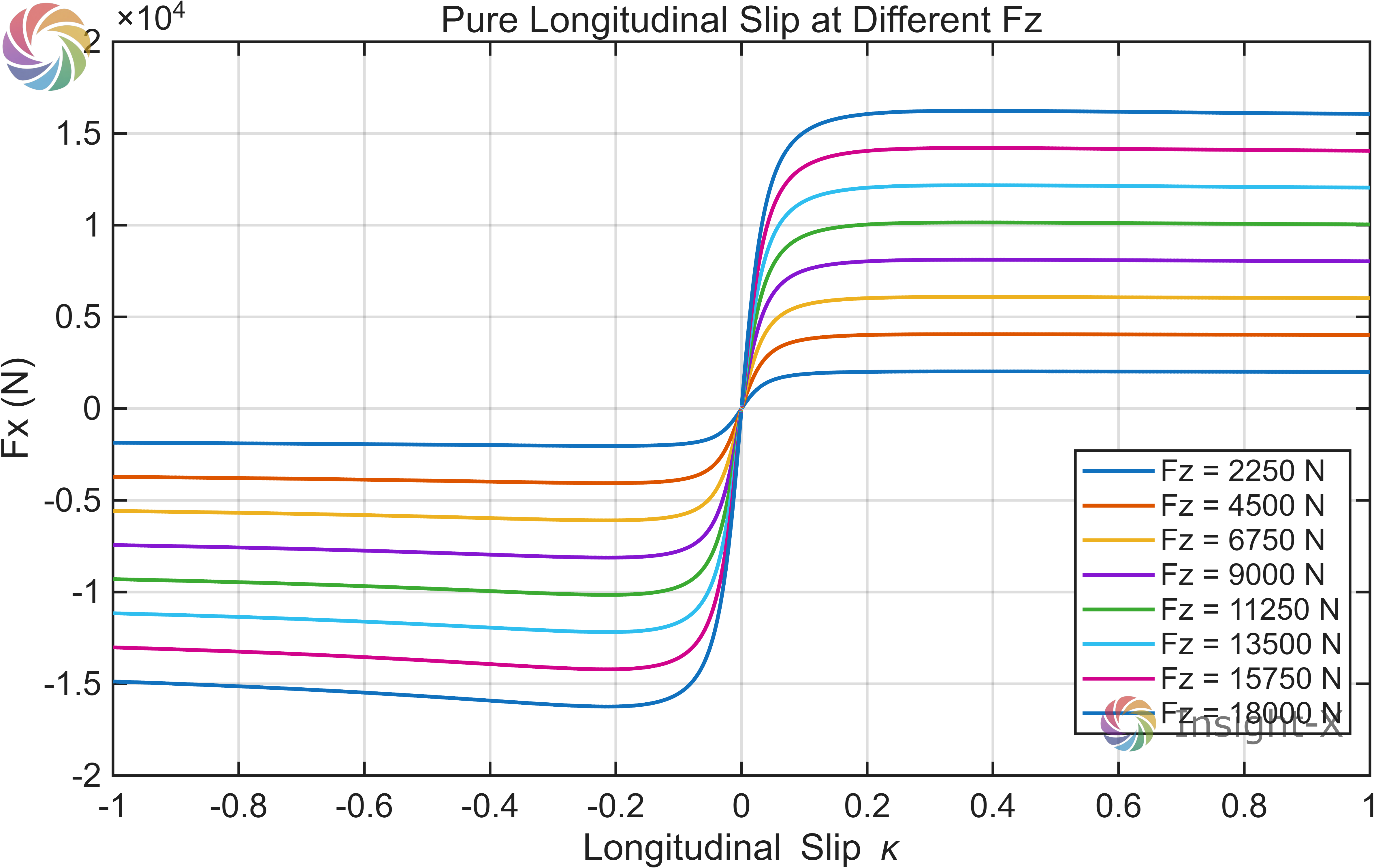 end只需要输入相应的纵向滑移率、侧偏角、轮胎路面摩擦系数、垂向力,即可计算一个轮胎的纵侧向力。 至此,魔术公式轮胎模型建立完成。通过输入不同的纵侧向滑移,可以绘制 1.纯纵滑纵向力 2.纯侧偏侧向力 3.组合滑移纵向力 4.组合滑移侧向力 四个图像,如下所示: