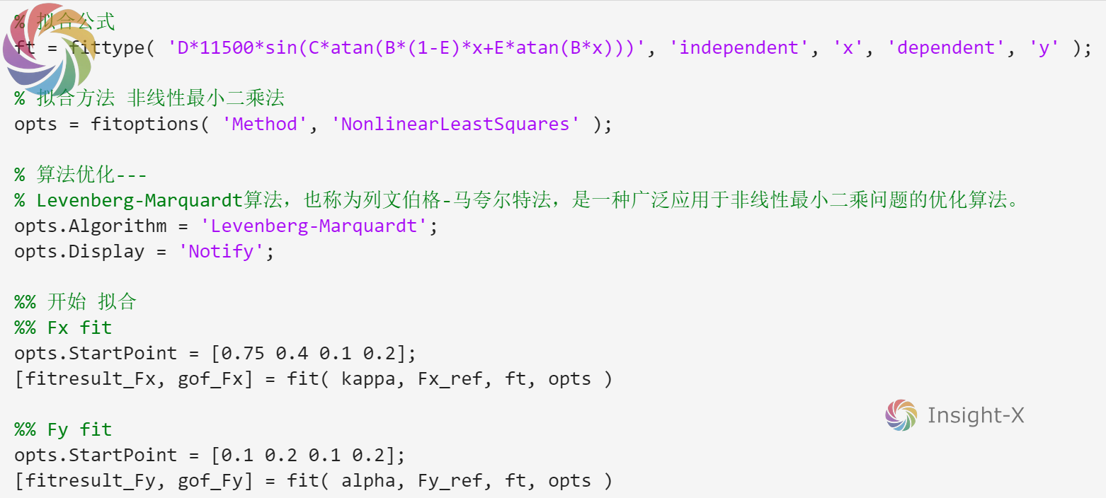 在得到魔术公式轮胎模型的参数后,便可以直接根据公式写出轮胎模型的计算函数,以 matlab 为例,其代码如下: